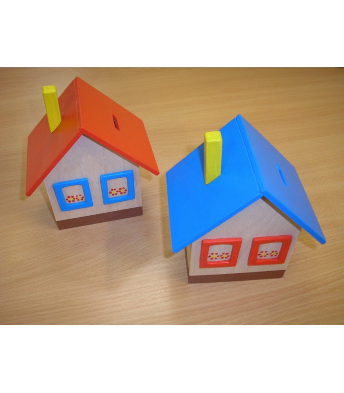 Pokladnička - domeček - je velmi originální! Celá je pěkně barevná, za okny má štětcem ručně malované květiny. Pokladnička má vysunovací dno.